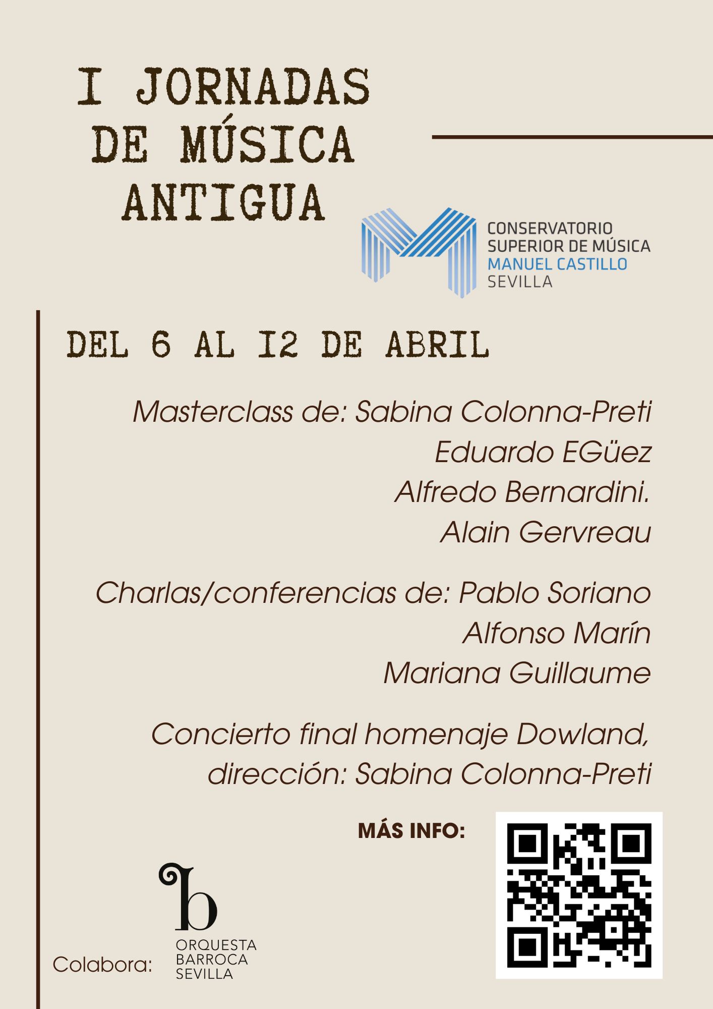 Del 6 al 12 de abril, el Conservatorio Superior de Música «Manuel Castillo» llevará a cabo sus primeras Jornadas de Música Antigua, unos días en los que nuestros profesores del