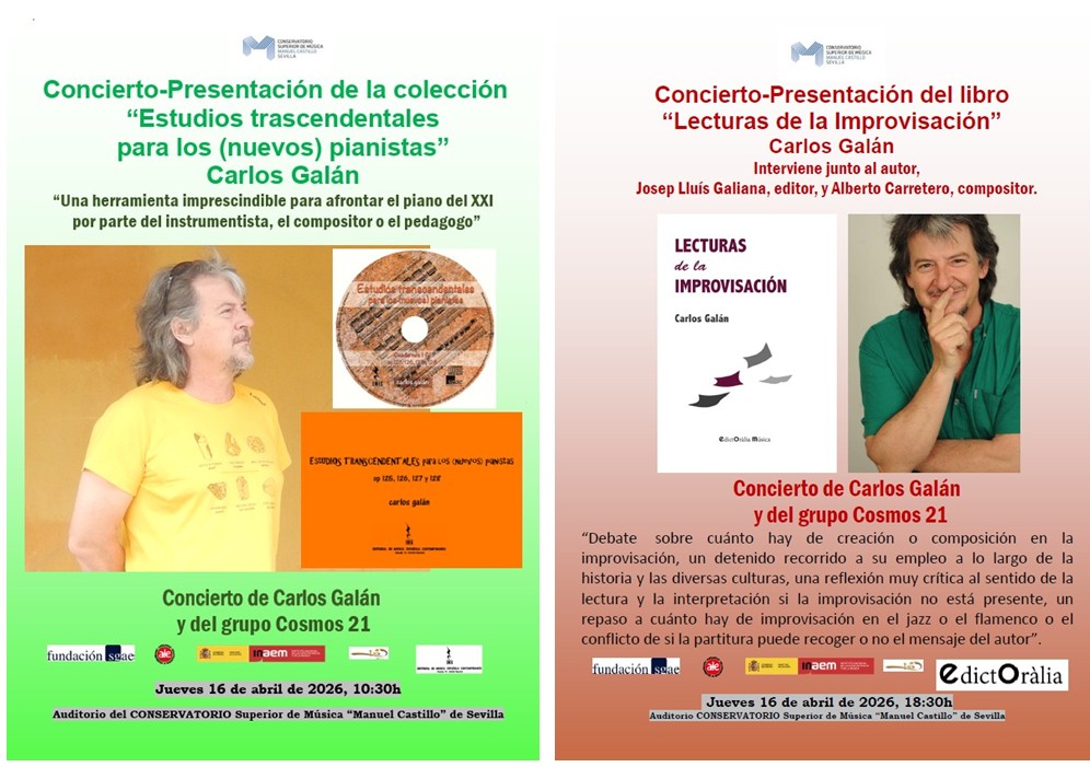 El próximo jueves 16 de abril: Doble presentación-doble concierto protagonizado por Carlos Galán. Disfrutaremos en el Conservatorio Superior de Música «Manuel Castillo» de Sevilla el próximo jueves 16 de abril, en