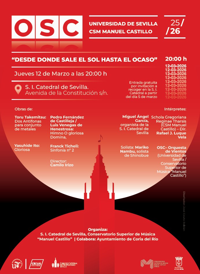 El próximo 12 de marzo de 2026, jueves, la OSC (Orquesta Sinfónica Conjunta), proyecto surgido de la colaboración entre Conservatorio Superior de Música «Manuel Castillo» y Universidad de Sevilla, en su versión como OSC Orquesta de Vientos, ofrecerá