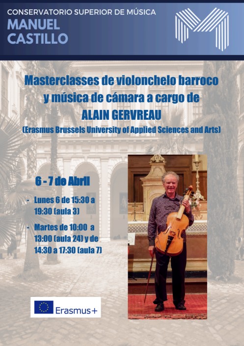 El Conservatorio Superior de Música «Manuel Castillo» anuncia la celebración los días 6 y 7 de abril, de unas excelentes clases magistrales de violonchelo barroco y música de cámara, impartidas por