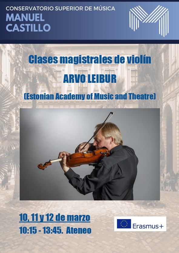 El Conservatorio Superior de Música «Manuel Castillo» anuncia la celebración de unas excelentes clases magistrales de violín a cargo del profesor y solista Arvo Leibur de la Estonian Academy of Music and Theatre (biografía), que acude mediante una beca ERASMUS+