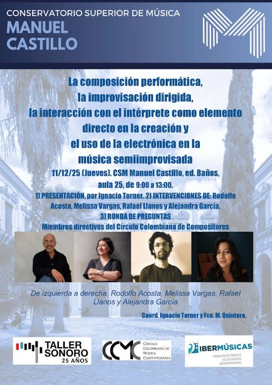 El Conservatorio Superior de Música «Manuel Castillo» , de la mano de Taller Sonoro, tiene el placer de anunciar la celebración de una charla que tendrá como protagonistas al Círculo Colombiano de Compositores.