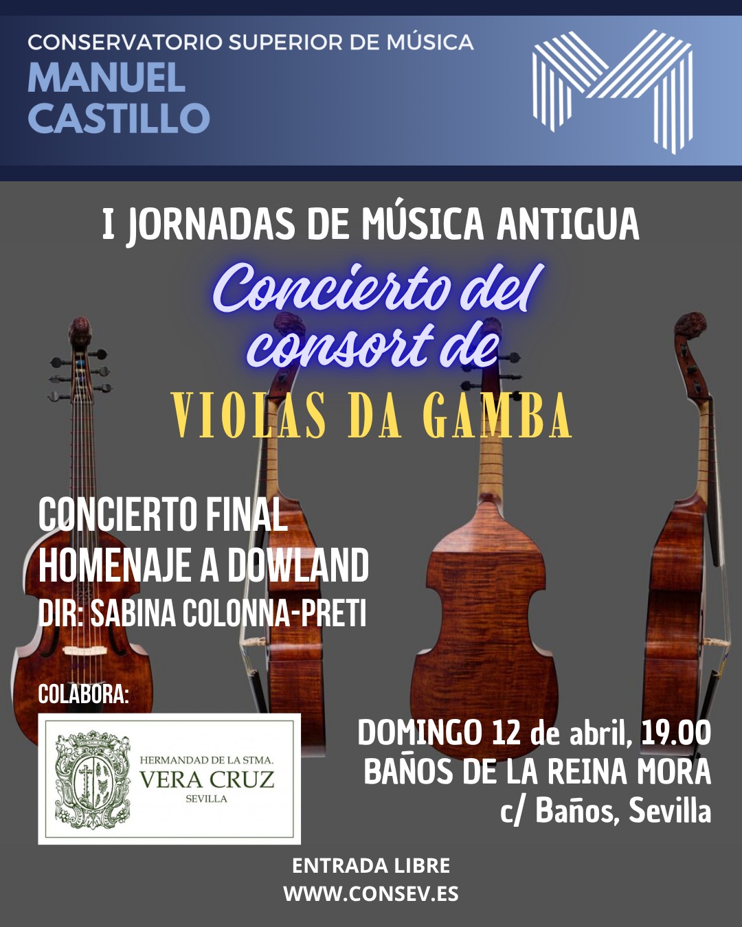 El próximo jueves, 15 de febrero, a las 19:30 h., el conjunto de violas da gamba y el alumnado de Canto Histórico del Conservatorio Superior de Música «Manuel Castillo» de Sevilla ofrecerán un concierto en el teatro del colegio José María del Campo, bajo la dirección de la profesora Viviana González.