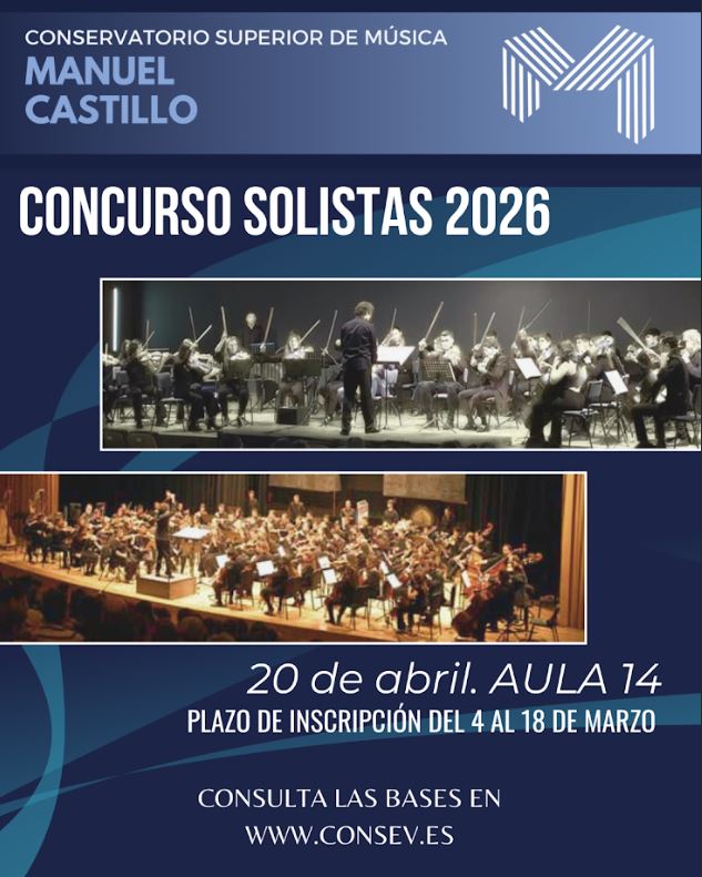 El Conservatorio Superior de Música «Manuel Castillo» de Sevilla convoca una nueva edición del Concurso de solistas, cuyas pruebas se celebrarán el próximo 20 de abril (lunes) en el Aula 14. El ganador, o ganadores, tendrá la opción de participar como solista en la programación de la OSC del curso 2026-2027.