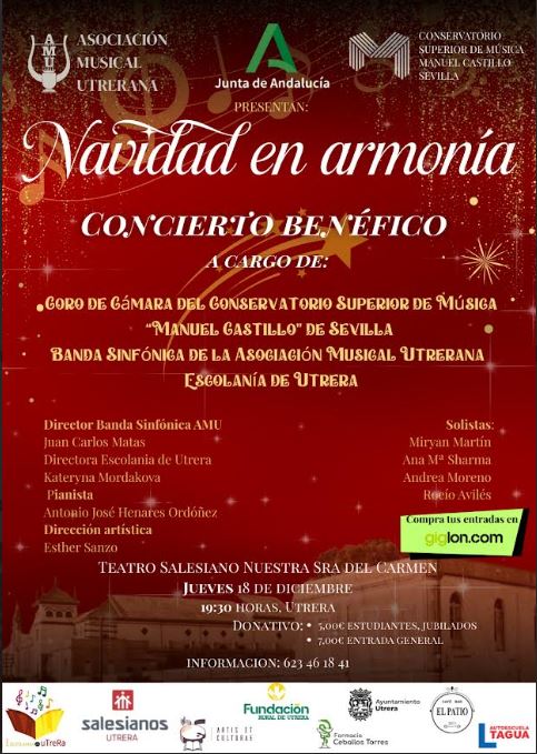 El Coro de Cámara del Conservatorio Superior de Música «Manuel Castillo» ofrecerá el próximo 18 de diciembre, jueves, un Concierto de Navidad en el Teatro Salesiano Nuestra Señora del Carmen (Utrera). El programa será dirigido por los alumnos de la especialidad de Dirección de Coro y en algunas obras se incorporarán la Banda de Música de la Asociación Musical Utrerana y la Escolanía de Utrera. Como pianista acompañante actuará nuestro profesor Antonio José Hernández.