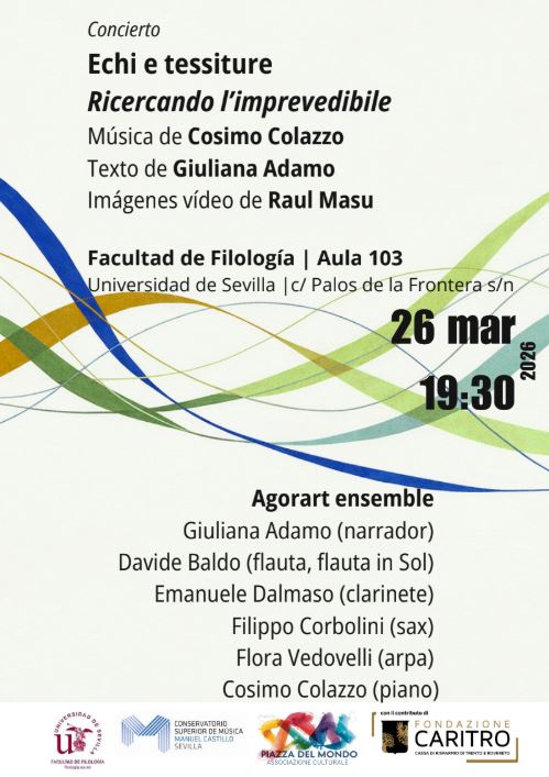 Un entrelazamiento de sonidos, palabras e imágenes para explorar el sentido profundo del acto creativo. El jueves 26 de marzo de 2026, a las 19:30 h, la Facultad de Filología de la Universidad de Sevilla (Aula 103) acoge «Echi e tessiture – Ricercando l’imprevedibile», un evento artístico que aúna música contemporánea, reflexión poética y dimensión visual en una experiencia inmersiva y evocadora.