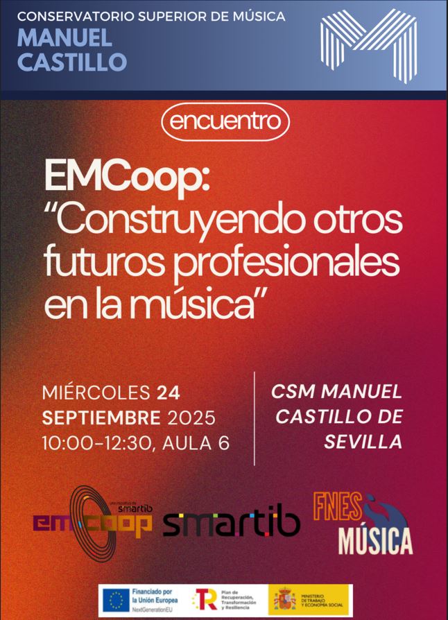 El Conservatorio Superior de Música «Manuel Castillo» anuncia la celebración de un interesantísimo evento titulado «Construyendo otros futuros profesionales en la música», organizado por la Federación Nacional de Estudiantes de Música. El objetivo de esta actividad es presentar al alumnado el trabajo de la Federación y, en especial, EMCoop: proyecto de Emprendimiento, Música y Cooperativismo desarrollado junto a Smart ibérica y financiado por el Ministerio de Trabajo y Economía Social.