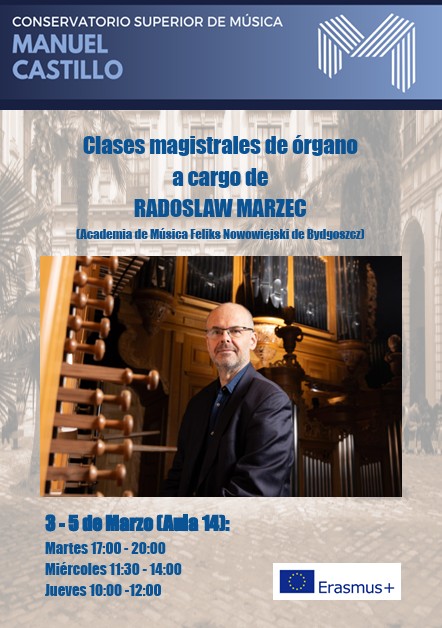 El Conservatorio Superior de Música «Manuel Castillo» la celebración de unas excelentes clases magistrales de órgano a cargo del profesor y solista Radoslaw Marzec (biografía), que acude mediante una beca ERASMUS+ desde la Academia de Música Feliks Nowowiejski de Bydgoszcz, Polonia.