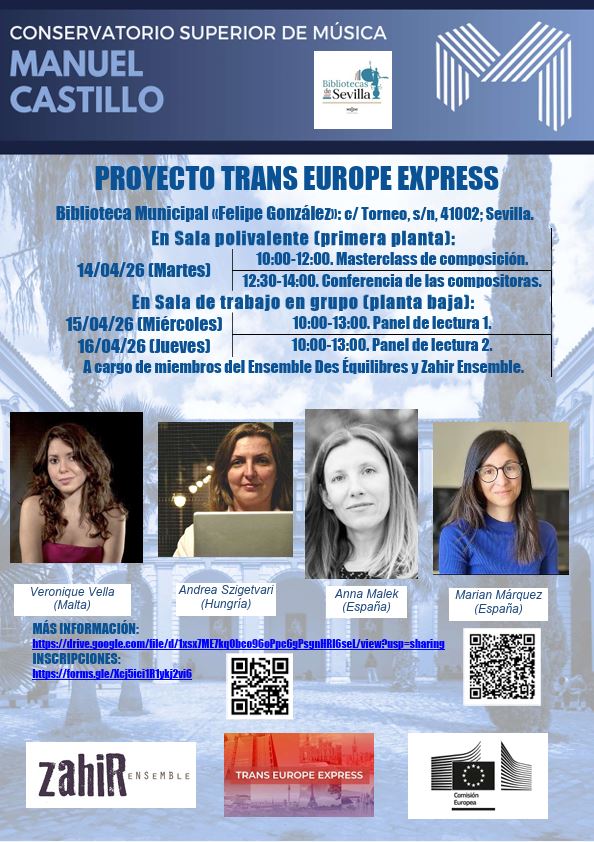 Nueva visita del Proyecto Trans Europe Express al Conservatorio Superior de Música «Manuel Castillo». Se propone un panel de lectura para las estudiantes de Composición de nuestro Centro.