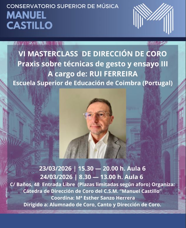 El Conservatorio Superior de Música «Manuel Castillo» anuncia la celebración, los días 23 y 24 de marzo de 2026, de la VIª Masterclass de Dirección de Coro, que versará especialmente sobre el tema: